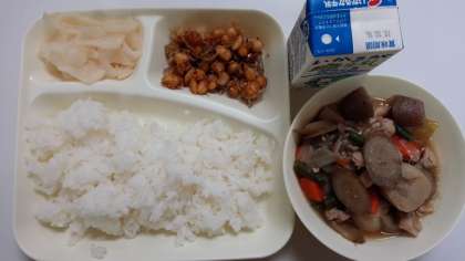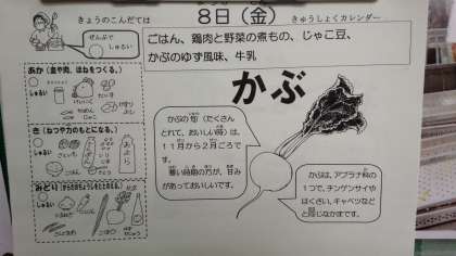 本日の献立は、鶏肉と野菜の煮物、かぶのゆず風味、じゃこ豆、ごはん、牛乳です。