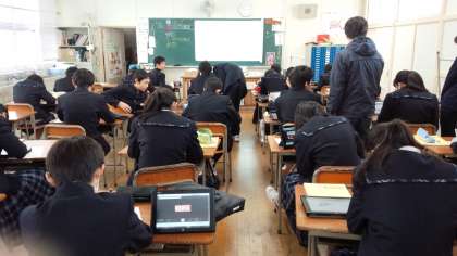 本日1時限目の、1年2組のタブレットを使った美術の授業の様子です。
