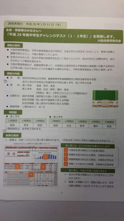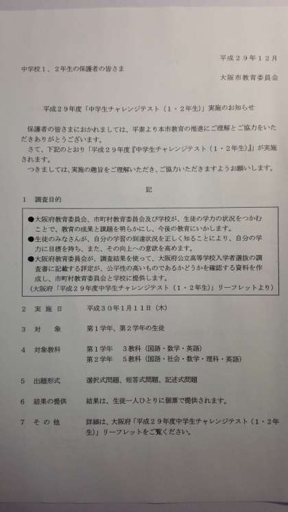 1年生は初めての「チャレンジテスト」に取り組んでいます。