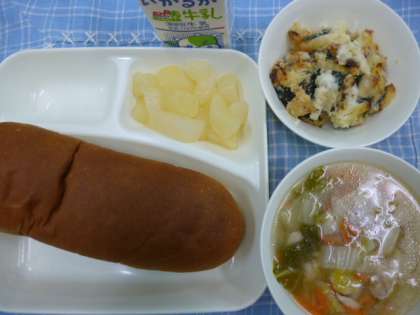 本日の献立は、黒糖パン、ホタテ貝のグラタン、スープ、和なし(カット缶詰め)、牛乳です。