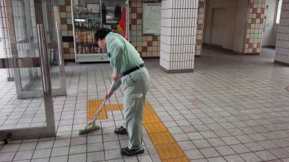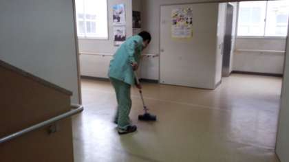 いつものように、管理作業員さんが、1時限目の間に、廊下、階段の雨のしずくを綺麗にふき取ってくださっています。