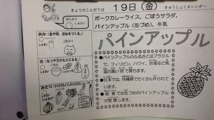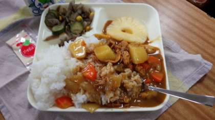 本日の献立は、ポークカレーライス、ごぼうサラダ、パインアップル(缶詰め)、牛乳です。
