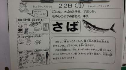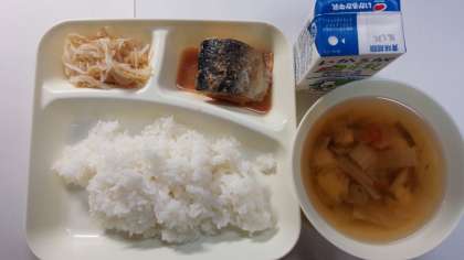 本日の献立は、さばのみそ煮、もやしのゆずの香あえ、すまし汁、ごはん、牛乳です。