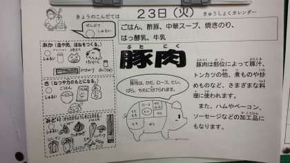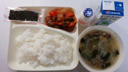 本日の献立は、酢豚、中華スープ、焼きのり、ごはん、発酵乳、牛乳です。