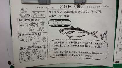 本日の献立は、あじのレモンマリネ、スープ煮、固形チーズ、ライ麦パン、牛乳です。