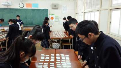 写真は、本日6時限目の、各クラスでの百人一首大会に向けての練習の様子です。