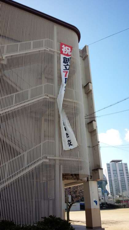 本日朝から管理作業員さんが垂れ幕を再度吊るしてくださいましたが、昼過ぎにはもうご覧のような有様です。
