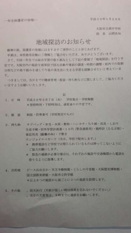 明日は班行動です。マナーを守って、しっかりとあいさつをして、事故なく無事に、大阪について学んできてほしいと思います。