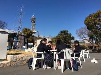 天王寺動物園内でお昼ご飯をいただいている班は、通天閣に見守られながら青空のもとで食べています。