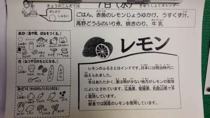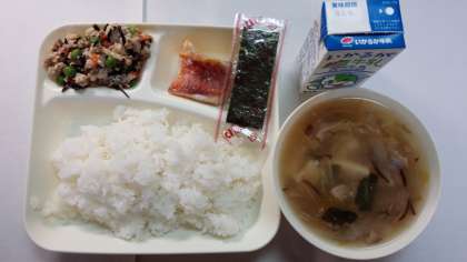 本日の献立は、赤魚のレモン醤油がけ、高野豆腐の炒り煮、焼き海苔、うすくず汁、ごはん、牛乳です。