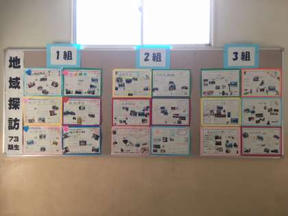 先日の地域探訪についての新聞を班ごとに作成しました。1年生の掲示板に掲示されています。学んできたことや、生徒の感想などが書かれていて、どの班も個性豊かな新聞が出来上がりました。