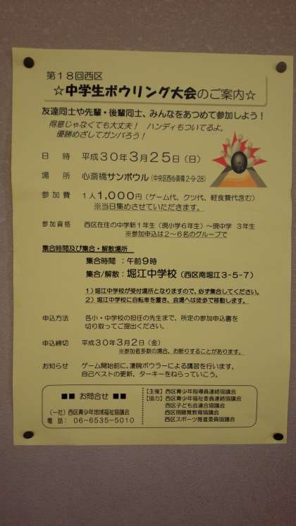 西区青少年指導員連絡協議会主催の「西区中学生ボーリング大会」のご案内を配付していますので、ご確認ください。