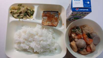 本日の献立は、さばのおろし醤油かけ、一口がんもと里芋のみそ煮、白菜のごま和え、ごはん、牛乳です。