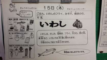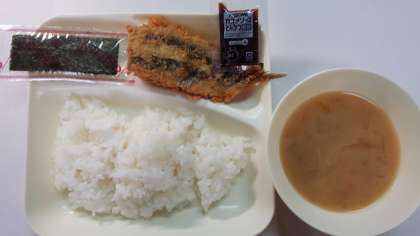 本日の献立は、いわしのフライ、みそ汁、焼きのり、ごはん、牛乳です。