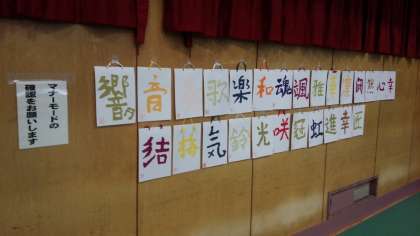 会場の体育館壁面には、国語の時間に作成した「ちぎり字」を展示していただきました。