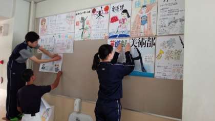 生徒会役員の皆さんが、新1年生廊下に、各部活動の紹介ポスターを貼ってくれています。
