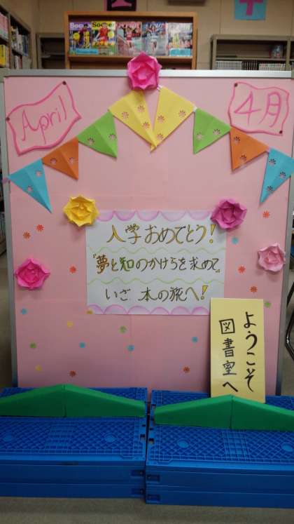 図書館の入り口の飾りつけも、4月に模様替えしています。