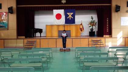 入学式の準備ができたあとは、入学式の「在校生歓迎のことば」「新入生誓いのことば」の練習です。