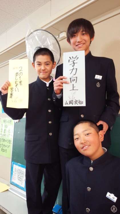 昨年度の1年1組では「いじめのない学校にする」と書き、拍手喝さいをうけましたが、本年度の2年1組で「学力向上」と書くと、生徒たちは神妙な面持ちでした。