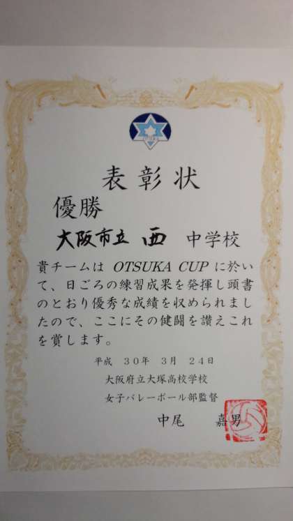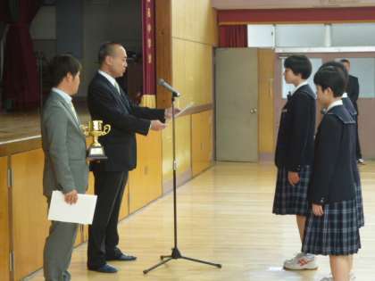 遅くなりましたが、始業式での、春休みに開催されたバレーボール部大会の表彰状の伝達の様子です。