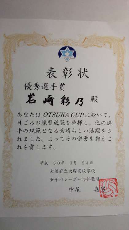 優秀選手賞 3年2組 岩崎 彩乃 さん