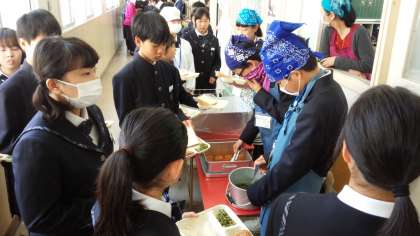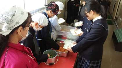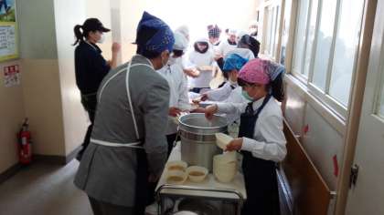 給食当番が3階まで持って上がり、各教室前廊下で配膳します。