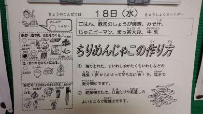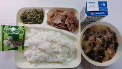 本日の献立は、豚肉の生姜焼き、じゃこピーマン、みそ汁、ごはん、牛乳、抹茶大豆です。