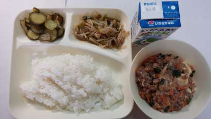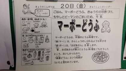 本日の献立は、マーボー豆腐、きゅうりの甘酢漬け、もやしとピーマンのごま炒め、ごはん、牛乳です。