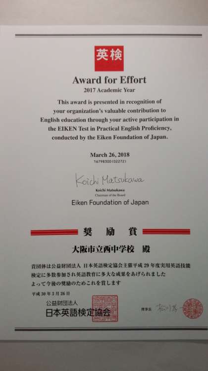 日本英語検定協会より、平成29年度成績優秀団体として本校が「奨励賞」を受賞しました。