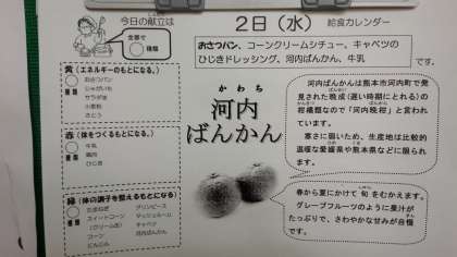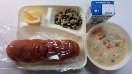 本日の献立は、コーンクリームシチュー、キャベツのひじきドレッシング、おさつパン、牛乳、河内ばんかんです。