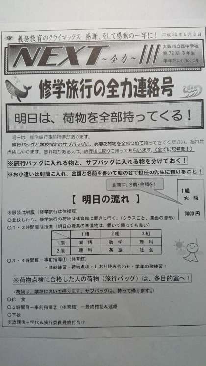 3年生学年だより「修学旅行の全力連絡号」