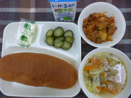 本日の献立は、コッペパン、じゃがいものミートグラタン、スープ、きゅうりのピクルス、マーガリン、牛乳です。