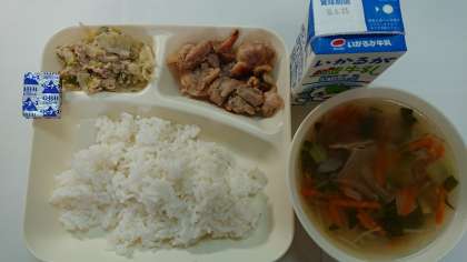 本日の献立は、鶏肉のオイスターソース焼き、ツナと野菜のごま炒め、中華スープ、ごはん、牛乳、固形チーズです。