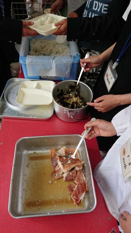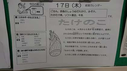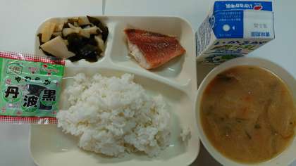 本日の献立は、赤魚の醤油だれかけ、若竹煮、みそ汁、ごはん、牛乳、ソフト黒豆です。