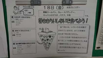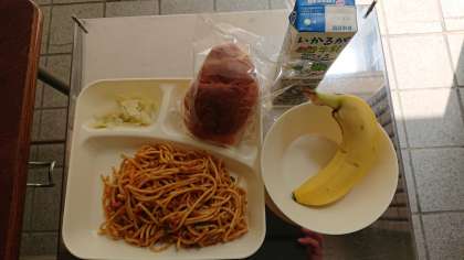 本日の献立は、カレースパゲッティ、キャベツのサラダ、バナナ、黒糖パン、牛乳です。