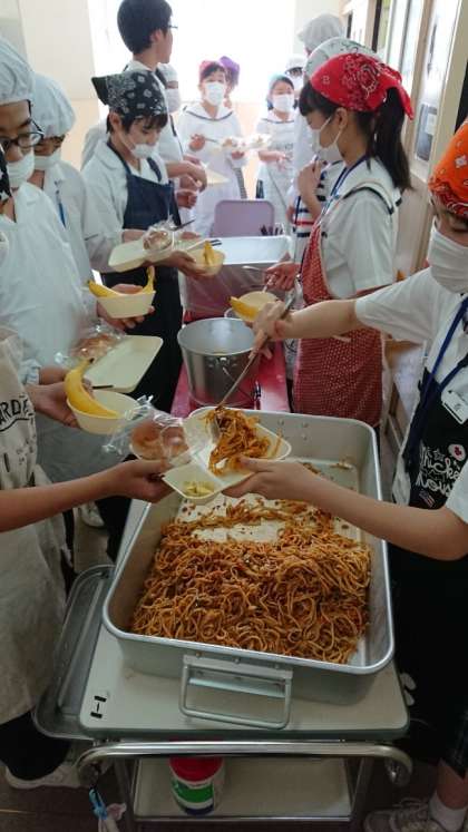 子どもたちに大人気のカレースパゲッティに黒糖パン、そのうえバナナが付きます。