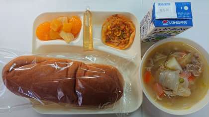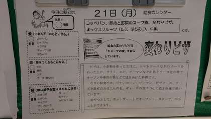本日の献立は、豚肉と野菜のスープ煮、変わりピザ、ミックスフルーツ(缶)、コッペパン、はちみつ、牛乳です。