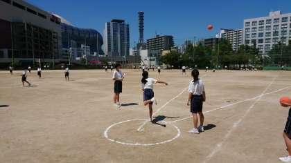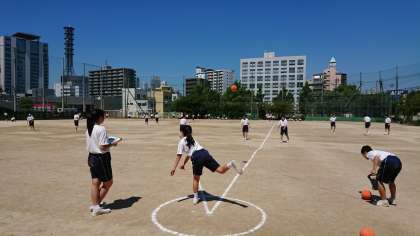 本日の2時限目、2年生3学級合同の体育の授業で「ハンドボール投げ」の測定を行いました。
