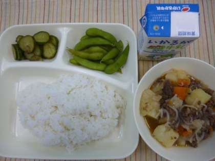 本日の献立は、ごはん、肉じゃが、きゅうりのかつお梅風味、枝豆、牛乳です。