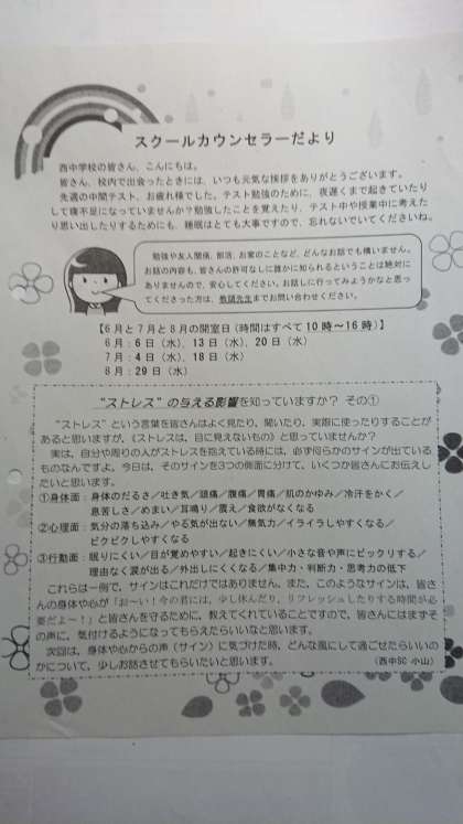 スクールカウンセラーの先生も、「スクールカウンセラーだより」を作成してくださいました。