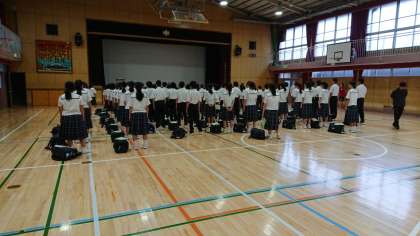 明日からの一泊移住に備えて、今日の学年集会は一泊移住の荷物を持っての学年集会です。