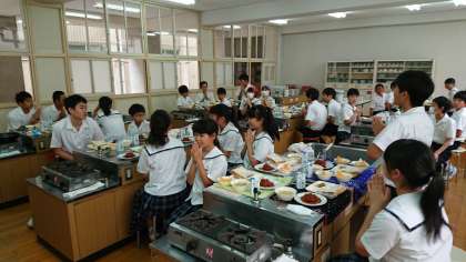 2年2組は、調理室で給食と一緒に「煮込みハンバーグ」もいただきます。