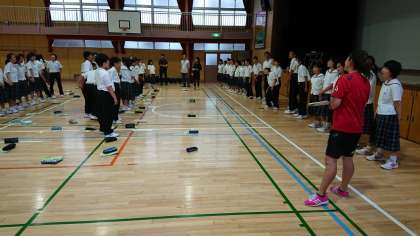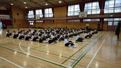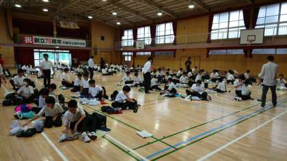 5時限目、1年生は体育館で一泊移住の前日指導です。
