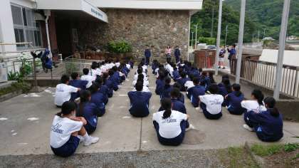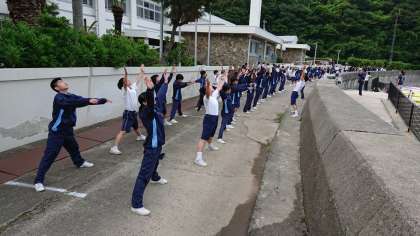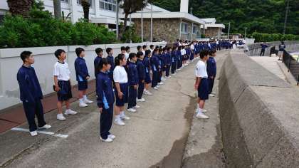 朝のつどい、ラジオ体操、校歌斉唱です!
