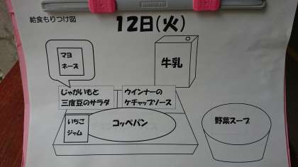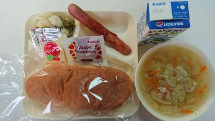本日の献立は、ウインナーのケチャップソース、じゃがいもと三度豆のサラダ、マヨネーズ、野菜スープ、コッペパン、いちごジャム、牛乳です。