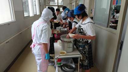 配膳員さんが、各クラスの配膳の様子を見て回ってくださっています。