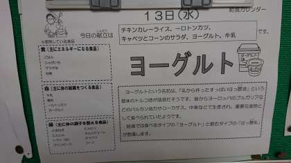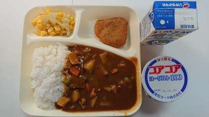 本日の献立は、チキンカレーライス、一口トンカツ、キャベツとコーンのサラダ、ヨーグルト、牛乳です。
