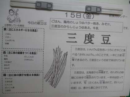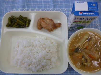 本日の献立は、ごはん、鶏肉のしょうゆバター焼き、みそ汁、三度豆のからしじょうゆあえ、牛乳です。