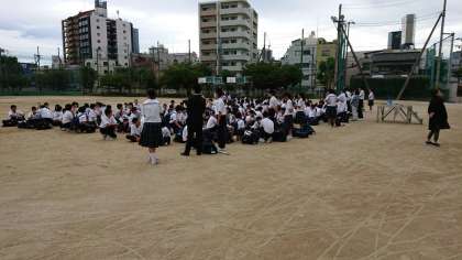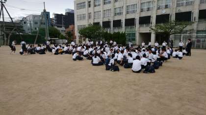 地震のため、登校した生徒は、教室に入れずに、全員運動場で避難してます。