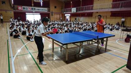 また、生徒を代表して、2年3組の水澤くんが、新井選手とみんなの前でラリーをしました。